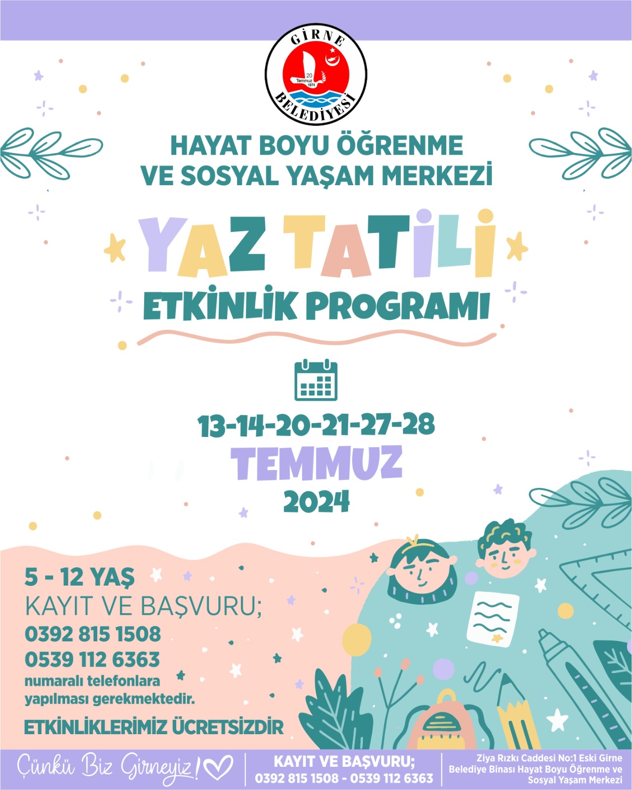 Girne Belediyesi Sosyal İşler Şubesi’ne bağlı Hayat Boyu Öğrenme ve Sosyal Yaşam Merkezi, 5-12 yaş aralığındaki çocuklar için yaz tatili etkinlik programı düzenliyor.