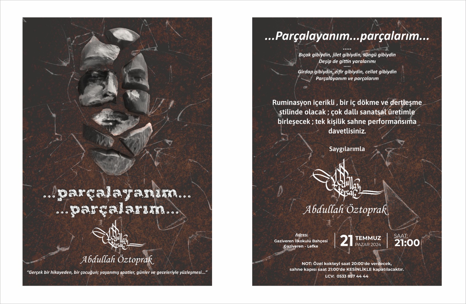 Abdullah Öztoprak, kendi yazmış olduğu tek kişilik oyunu “Parçalayanım, Parçalarım”ı pazar günü Gaziveren’de sahneleyecek.