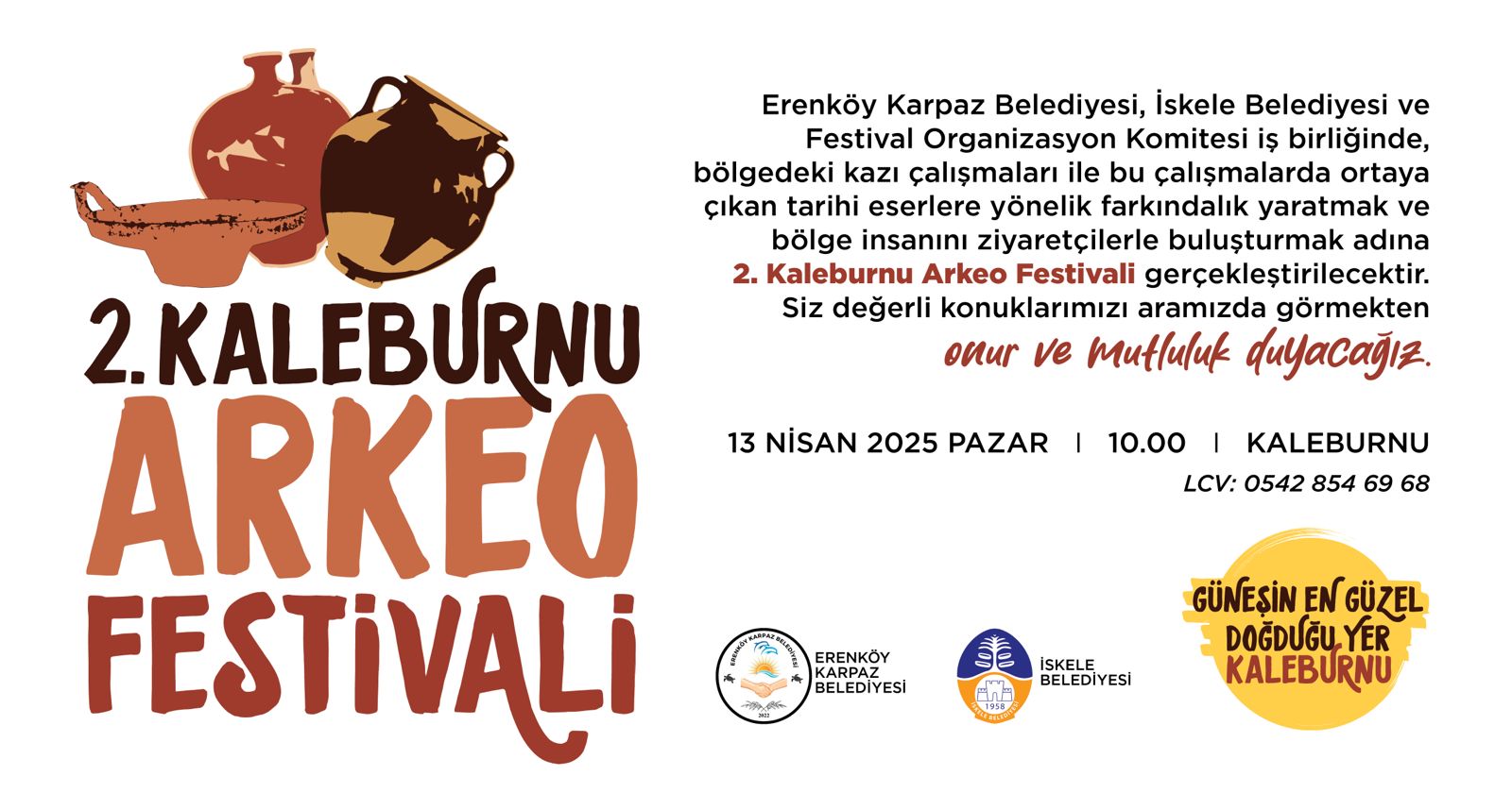 Erenköy- Karpaz Belediyesi, İskele Belediyesi ve Kaleburnu Arkeo Festivali Organizasyon Komitesi iş birliğinde düzenlenecek olan 2. Kaleburnu Arkeo Festivali 13 Nisan Pazar günü saat 10.00’da yapılacak.