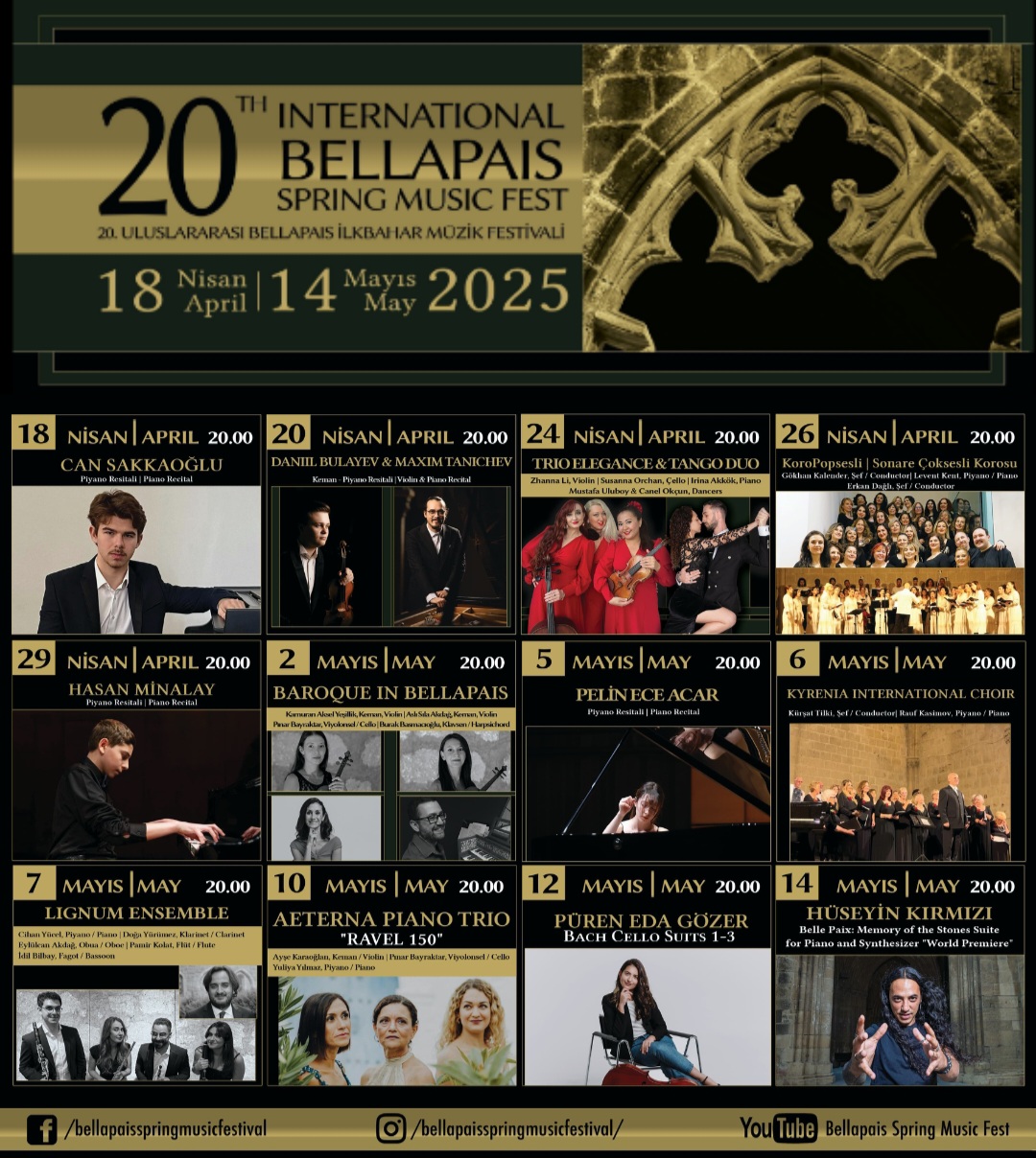 “18 Nisan Can Sakkaoğlu Piyano Resitali, 20 Nisan Daniil Bulayev & Maxim Tanichev Keman- Piyano Resitali, 24 Nisan Trio Elegance & Tango Duo, 26 Nisan KoroPopsesli & Sonare Çoksesli Korosu, 29 Nisan Hasan Minalay Piyano Resitali, 2 Mayıs Baroque in Bellapais, 5 Mayıs Pelin Ece Acar Piyano Resitali, 6 Mayıs Kyrenia International Choir, 7 Mayıs Lignum Ensemble, 10 Mayıs Aeterna Piano Trio