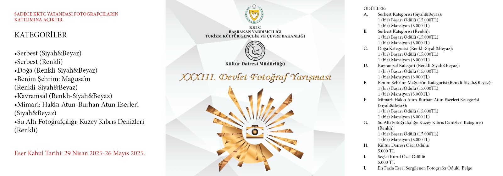 Açıklamada, ödül töreni ve sergi açılışının 19 Ağustos Dünya Fotoğrafçılık Günü’nde, Lefkoşa’da Kültür Dairesi’nin belirleyeceği bir sergi salonunda yer alacağı belirtildi.