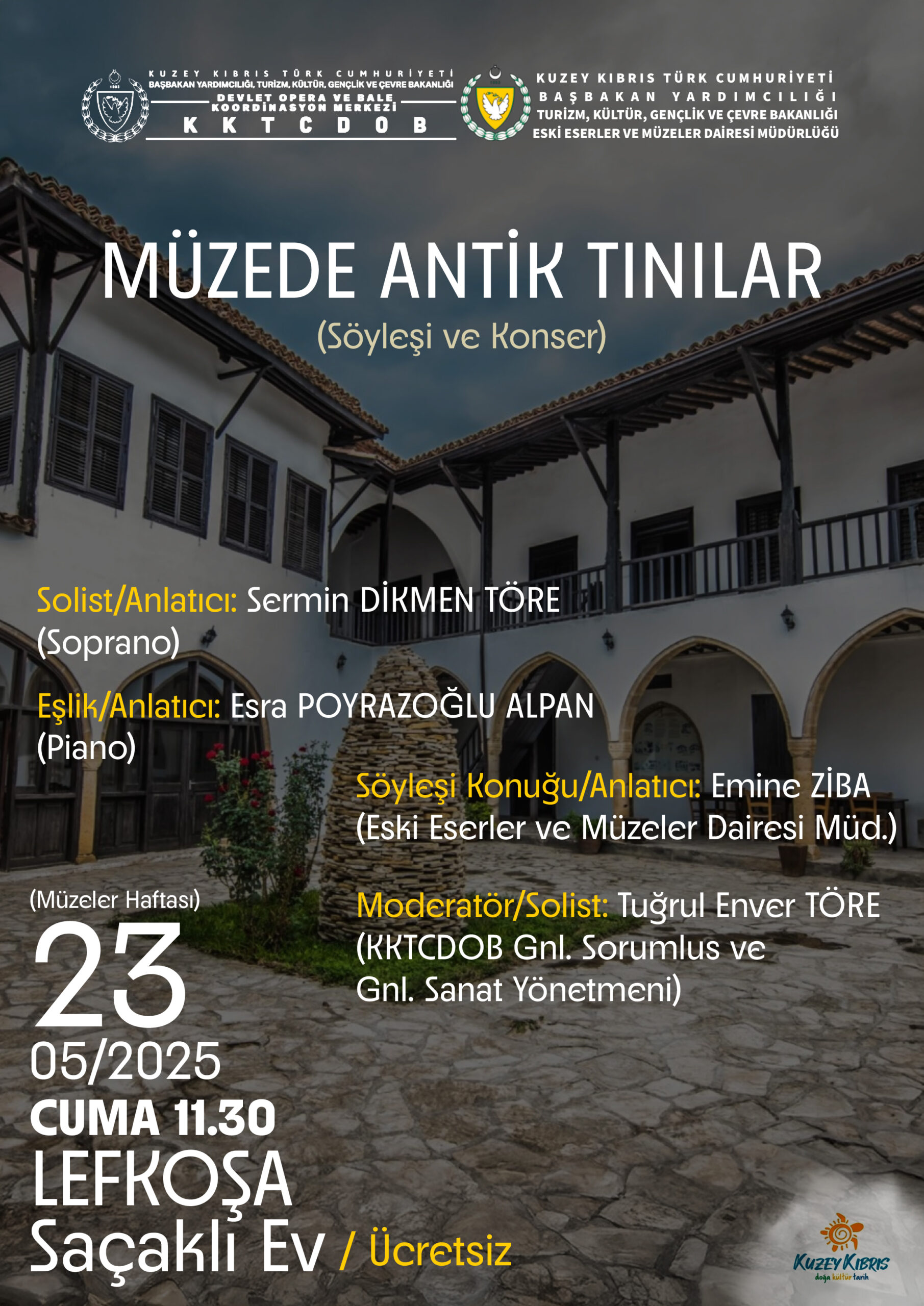 Başbakan Yardımcılığı Turizm, Kültür, Gençlik ve Çevre Bakanlığı’na bağlı Devlet Opera ve Bale Koordinasyon Merkezi (KKTCDOB) ile Eski Eserler ve Müzeler Dairesi Müdürlüğü, 22 ve 23 Mayıs’ta “Müzede Antik Tınılar” temasıyla etkinlikler düzenleyecek.
