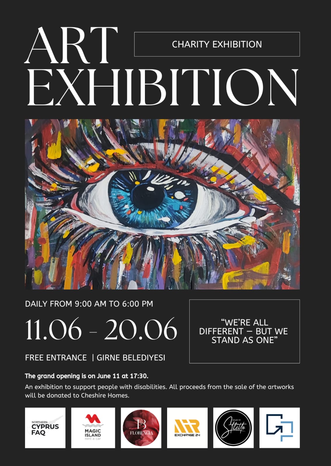 Girne Belediyesi’nden yapılan açıklamaya göre, “sanatı ve toplumsal dayanışmayı bir araya getiren” sergi, 20 Haziran Cuma güne kadar Girne Belediyesi Yeni Hizmet Binası Sergi Salonu’nda, hafta içi her gün 9.00 – 15.30 saatleri arasında ücretsiz ziyaret edilebilecek.