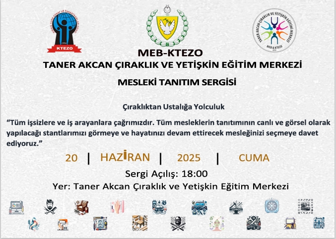 Milli Eğitim Bakanlığı (MEB) ile Kıbrıs Türk Esnaf ve Zanaatkarlar Odası (KTEZO) iş birliğinde, Taner Akcan Çıraklık ve Yetişkin Eğitim Merkezi’nde “Mesleki Tanıtım Sergisi” açılacak.