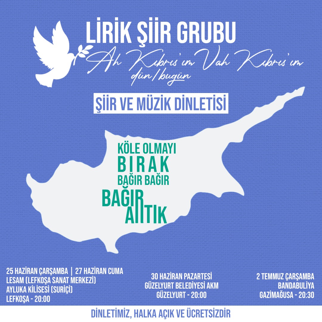 Kıbrıs Edebiyat Derneği çatısı altında faaliyetlerini sürdüren Lirik Şiir Grubu, “Ah Kıbrıs’ım, Vah Kıbrıs’ım-Dün/Bugün” şiir ve müzik dinletisiyle sanatseverlerle buluşacak.
