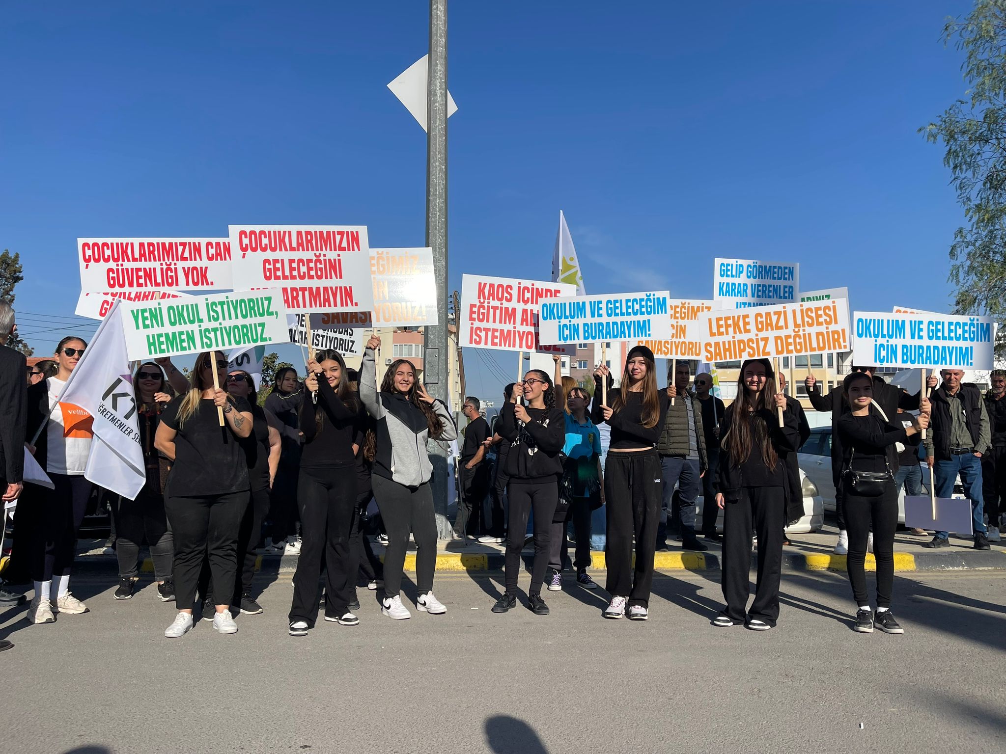 Lefke Gazi Lisesi öğrencileri ve velileri deprem riski taşıyan okul binasında adım atılmadığı gerekçesiyle Başbakanlık önünde eylem yaptı.