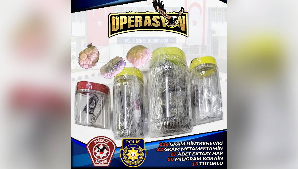 Narkotik ve Kaçakçılığı Önleme Müdürlüğü ile Polis Ekiplerince, Gazimağusa, Girne ve İskele ilçelerinde koordineli şekilde dün gerçekleştirilen “Temiz Sokaklar Operasyonu” kapsamında yapılan ev, araç ve şahıs üst aramaları sonucunda; satışa hazır paketler halinde toplam 236 gram ağırlığında hintkeneviri türü, 22 gram ağırlığında metamfetamin türü ile 50 miligram ağırlığında kokain türü uyuşturucu madde, sentetik cannabinoid türü uyuşturucu madde içeren 10 adet kağıt, MDMA (extasy) türü uyuşturucu madde içeren toplam 67 adet hap, tütünle karışık uyuşturucu madde içeren 5 adet sarma sigara ile üzerlerinde uyuşturucu madde kalıntısı olan 3 adet hassas terazi, 2 adet öğütücü ve cam pipo ele geçirildi.