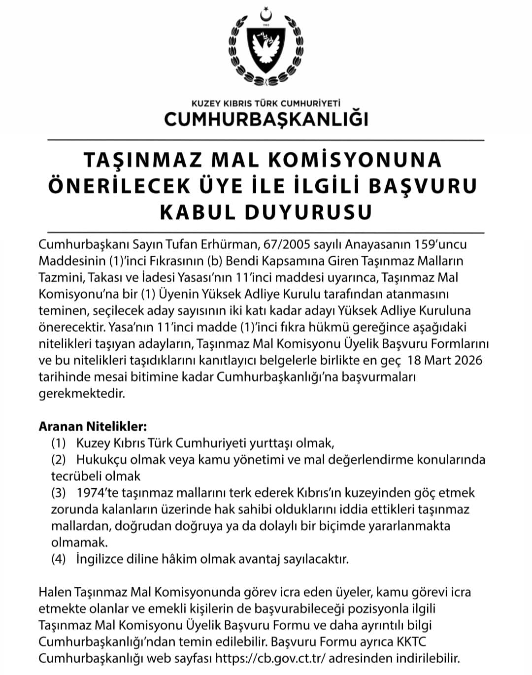 “Kuzey Kıbrıs Türk Cumhuriyeti yurttaşı olmak, hukukçu olmak ya da kamu yönetimi ve mal değerlendirme konularında tecrübeli olmak, 1974 yılında taşınmaz mallarını bırakarak Kıbrıs’ın kuzeyinden göç etmek zorunda kalan kişilerin hak iddia ettiği taşınmaz mallardan doğrudan veya dolaylı biçimde yararlanmıyor olmak ve İngilizce diline hâkim olmak (avantaj sayılacak).”